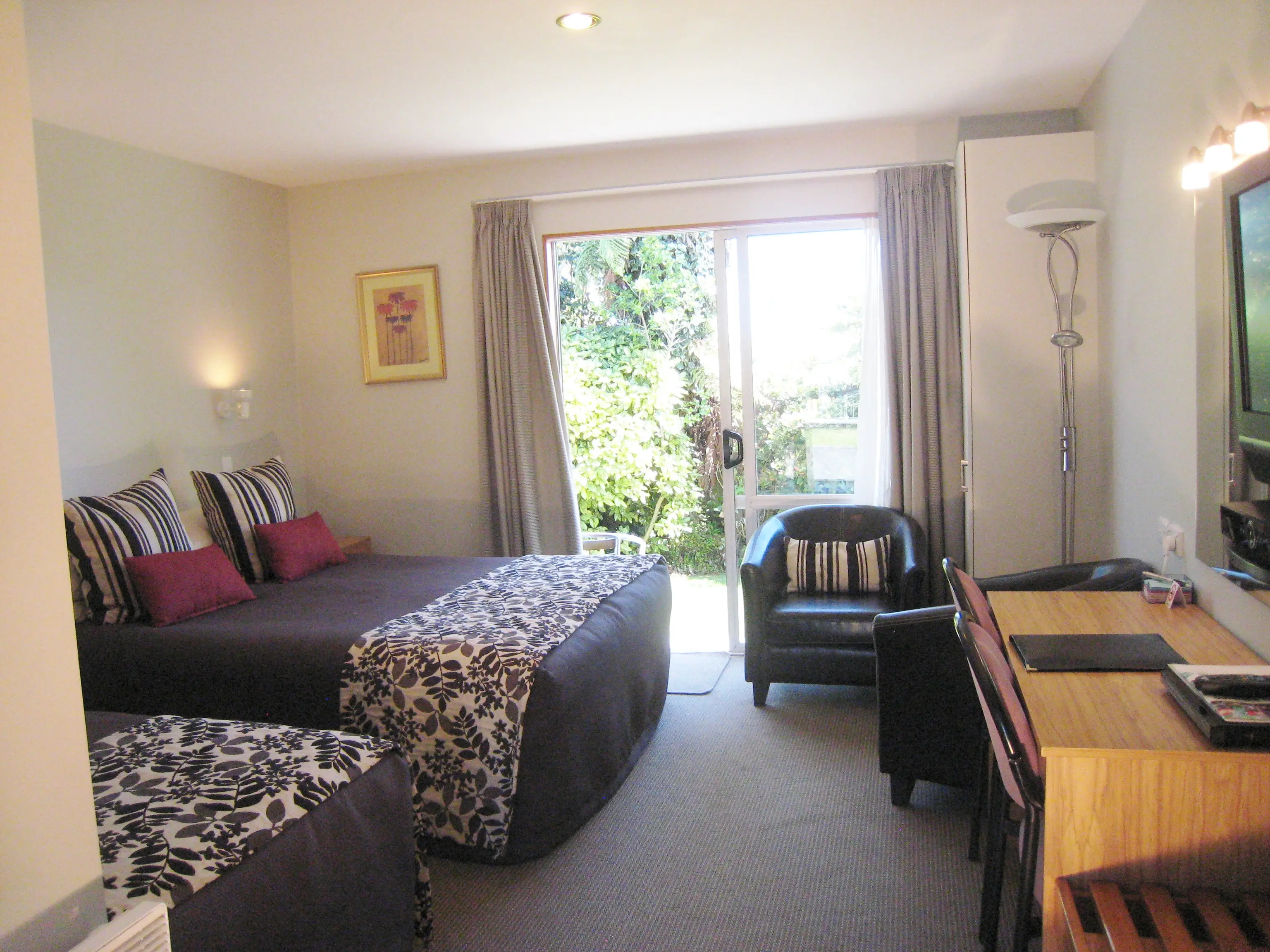Queen and Single bed. Tea/Coffee/Toast-making facilities plus a microwave for heating food. You relax, our staff will wash dishes in the morning! Well lit desk area with two chairs plus 2 leather arm chairs for relaxing. Free Wifi broadband, LCD TV, Guest Select Sky, and DVD player with a great selection of DVDs. A choice of quality teas and coffees, including plunger coffee. Lovely new shower room, with quality amenities, heating and heated towel rails .Breakfast service, undercover parking.
