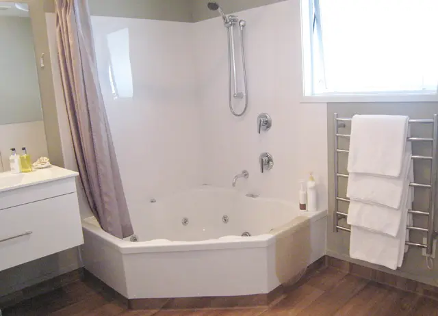 Beautifully renovated two bedroom unit with disabled access. This is our front unit, nearest the road, but dont be put off, it has double glazing and is very quiet at night. King bed in first bedroom, Double and Single in the second bedroom and fold-out slatted sofabed in the lounge. Free broadband wifi available. Spacious lounge/dining area has 42LCD TV, Guest Select Sky and DVD player with a second TV and DVD player in the main bedroom. A choice of quality teas and coffees, including plunger coffee. Lovely, spacious new wet floor shower room with fold down seat, quality amenities, heating and heated towel rail . Kitchen has ceramic hob, microwave oven and electric frypan. This apartment does not open onto the deck, access is at the kitchen door where there is undercover parking. Breakfast service, Undercover parking.